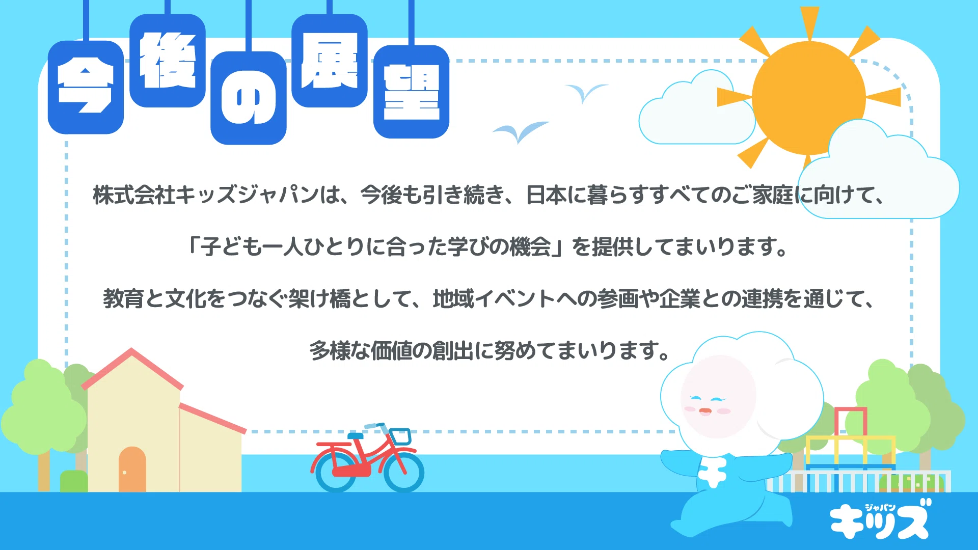 株式会社キッズジャパンは、今後も引き続き、日本に暮らすすべてのご家庭に向けて、「子ども一人ひとりに合った学びの機会」を提供してまいります。教育と文化をつなぐ架け橋として、地域イベントへの参画や企業との連携を通じて、多様な価値の創出に努めてまいります。